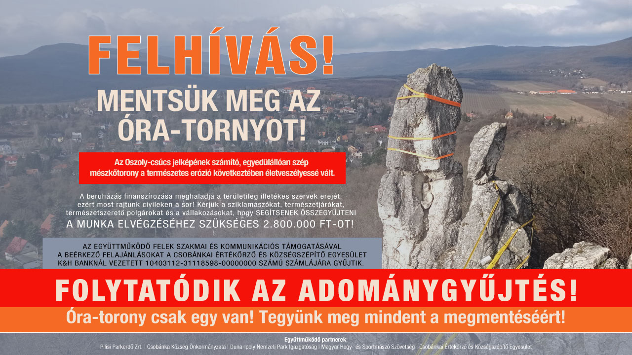 A meghirdetett határidőig 1 935 700 Ft gyűlt össze az Oszoly-csúcs jelképének számító, egyedülállóan szép mészkőtorony, az Óra-torony megmentésére. A természetes erózió következtében életveszélyessé vált sziklatorony megmentéséhez szükséges munkálatok költsége 2 800 000 Ft lenne, ehhez hiányzik még 864 300 Ft.