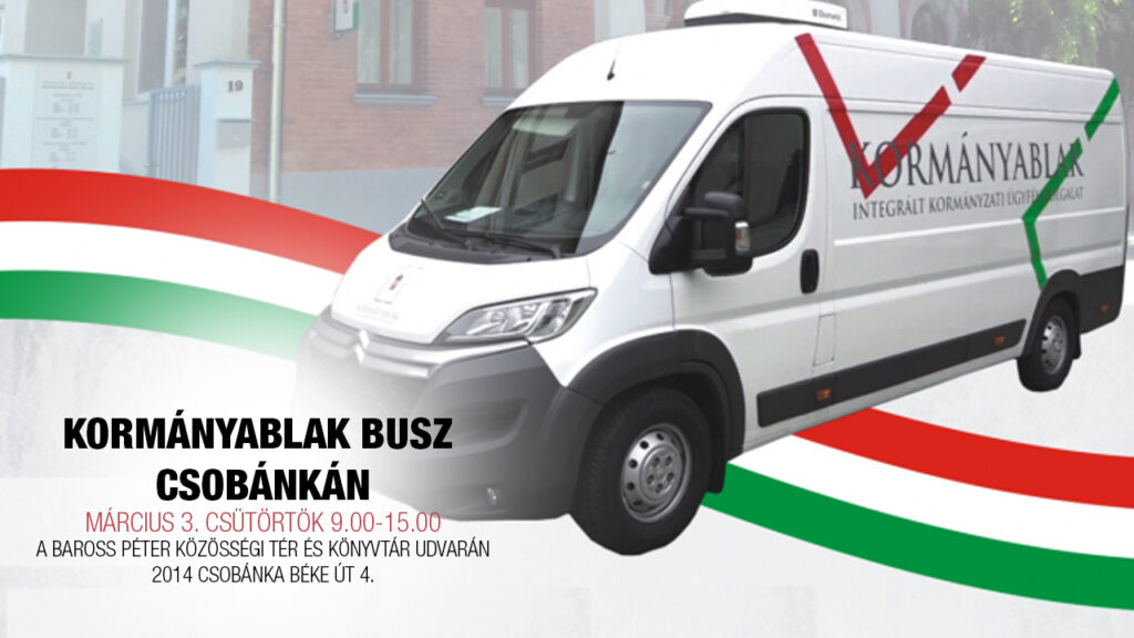 Március 3-tól havi rendszerességgel érkezik a Mobilizált Kormányablak Ügyfélszolgálat, népszerűbb nevén a kormányablak busz Csobánkára. A szolgáltatás a Baross Péter Közösségi Tér és Könyvtár (Béke út 4.) udvarán lesz elérhető. Számos ügytípust intézhetnek helyben, és tájékozódhatnak személyesen az egyes eljárásokról a csobánkaiak.