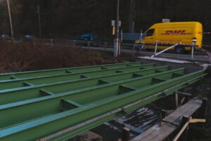 A tervek szerint halad a Nádas utcát a Fő úttal összekötő híd felújítása. Korábban a régi hidat a vasszerkezetig visszabontották, a fém részeket felületkezelték. A napokban kezdte meg a Szomolyai Fűrészüzem a híd faszerkezetének felépítését, amit erős fém pántokkal rögzítettek a patak felett átívelő gerendákhoz. A mai napon már a híd korlátja is a helyére került. Rövidesen sor kerül a híd járófelületének rögzítésére is, azután már csak a két úthoz való csatlakozás kiépítése lesz hátra az átadásig.