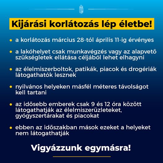 A kormány március 28-tól kijárási korlátozást vezet be Magyarország egész területére. Lakóhelyünket két héten keresztül csak munkavégzés vagy az alapvető szükségletek ellátása céljából hagyhatjuk el – jelentette be Orbán Viktor miniszterelnök. Csobánka lakosságát is kérjük a korlátozások betartására.