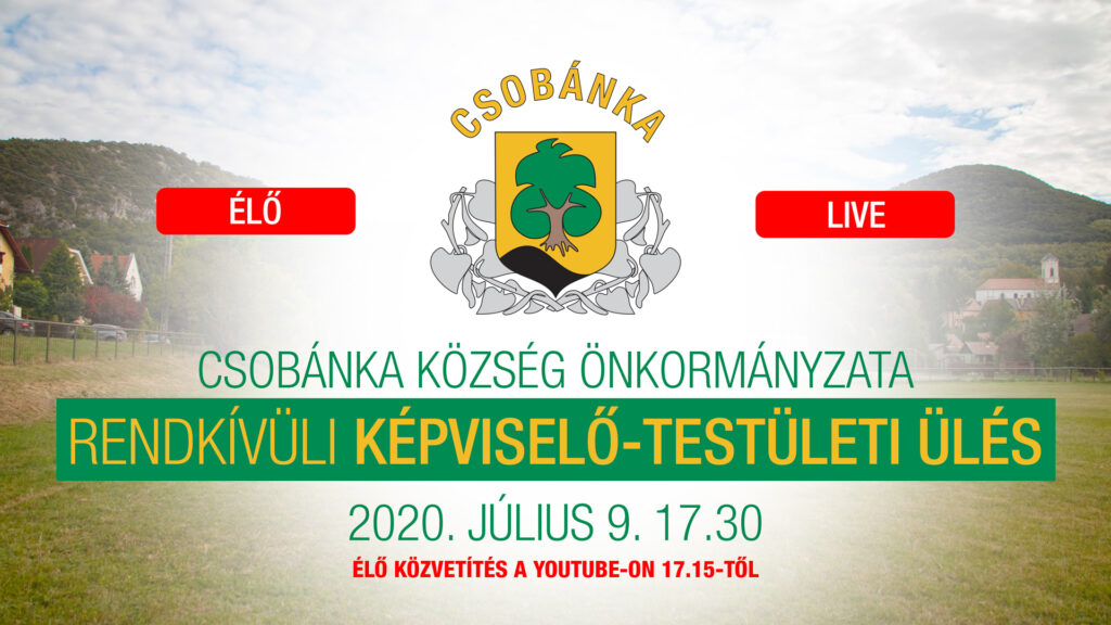 Csobánka Község Önkormányzatának Képviselő-testülete 2020. július 9-én (csütörtökön) 17.30 órai kezdettel rendkívüli nyilvános ülést tart a Baross Péter Közösségi Tér és Könyvtár épületében.