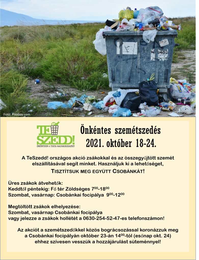 A TeSzedd! – Önkéntesen a tiszta Magyarországért akció ma hazánk legnagyobb önkéntes mozgalma. Idén immár kilencedik alkalommal valósul meg. A szemétgyűjtési akció keretében szerte az országban „nagytakarítanak” a TeSzedd! önkéntesei. Csobánka idén is csatlakozik az akcióhoz. Helyi civilek koordinálásával, a település több pontján önkéntes szemétszedést szerveznek, együttműködésben a helyi szervezetekkel, és várják a jelentkezőket, akik megtisztítanának egy-egy területet.