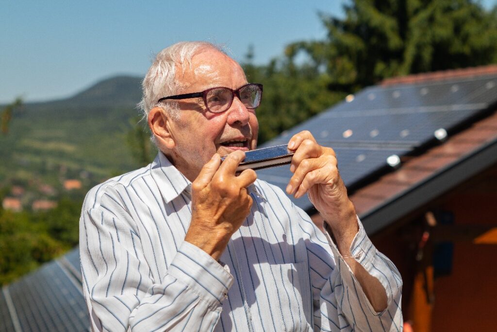Amikor eddig jutunk a beszélgetésben, már elő is kerül a szájharmonika. Lajos bácsi szeretné zenével is kifejezni az örömét. Beethoven Örömódáját játssza nekem. Megtisztelő, megható pillanat. A tikkasztó nyári napnál is lelkesebb ragyogást látok rajta. Előjön az ifjonti hév, a harmonikán megcsillanó fénysugár is örömtáncot jár. Egy egészen különleges pillanatnak lehetek részese. Néhány perce még a Szentírásról beszéltünk, Noé bárkájáról volt szó. Most pedig, ahogy felcsendül a dallam, egy szempillantás alatt kiárad valami, ami talán csak azokból tud így szólni, akik már életük operájának számos tételét eljátszották, a nagy áriák javát átadták a közönségnek. Percnyi hanggá sűrűsödik a közel kilenc évtized, olyan csatorna nyílik, ami túlmutat a szavakon. Az itt és most érzésébe kerülünk, a dalra figyelnek a fák, a madarak. Sőt, még a szomszéd kislány is. „Csókolom Lajos bácsi, várjuk az esti muzsikát”, szól a csicsergő hang a bokrok leveleinek zizegésébe keveredve. Minden benne van ebben a pillanatban. Talán maga az erdő szólt hozzánk, a fák szelleme, akik már oly sokat hallhatták ezt a szép muzsikát.