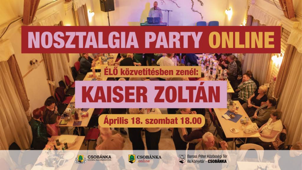 A hétvégén ismét Nosztalgia Party lesz Csobánkán, de sajnos csak online. A járványügyi szabályok betartása mellett április 18.-án, szombaton 18.00-kor a kamera elé áll a közösségi tér mulatságainak népszerű zenésze: Kaiser Zoltán.